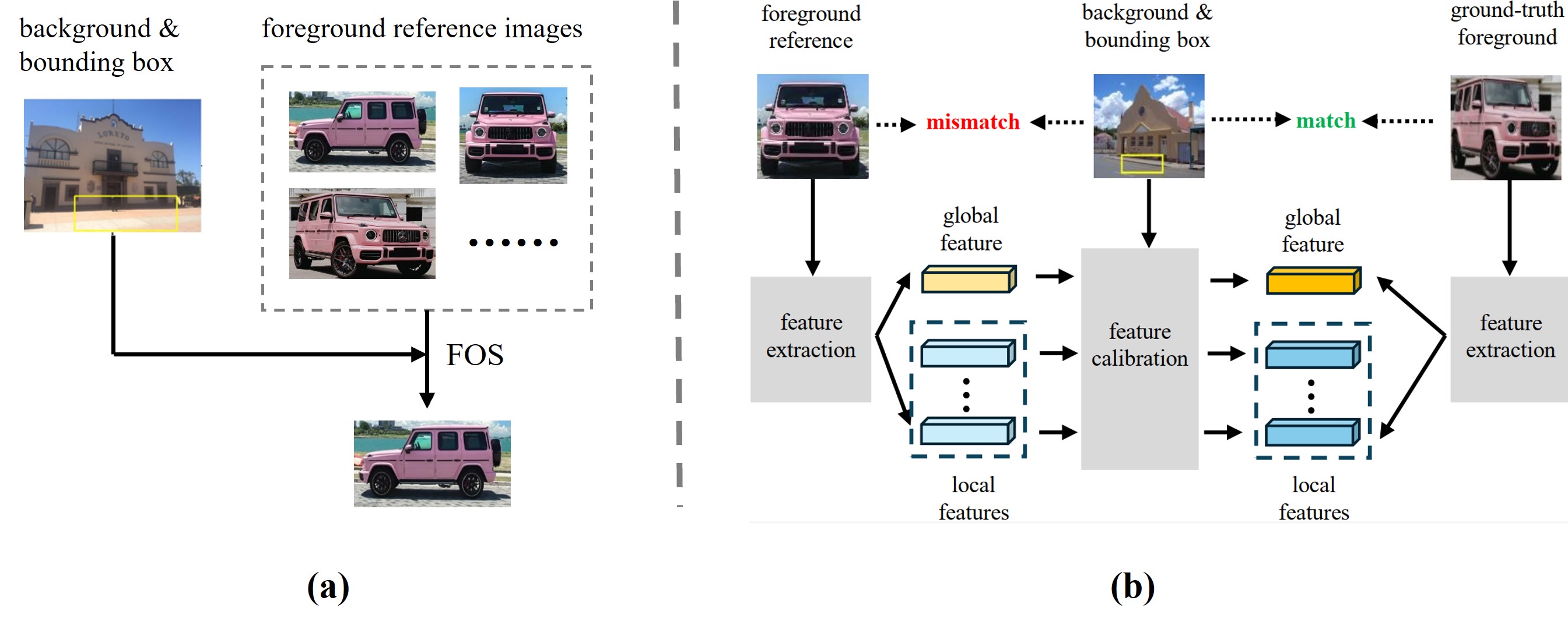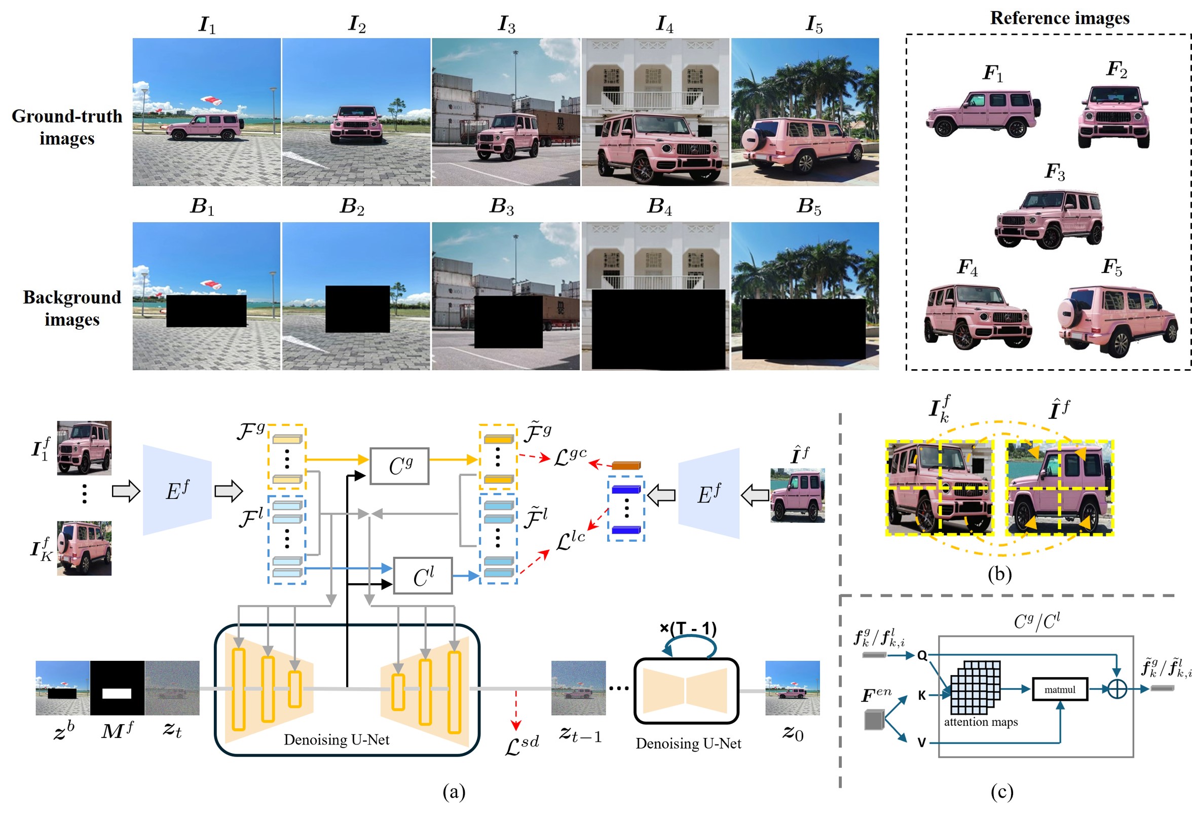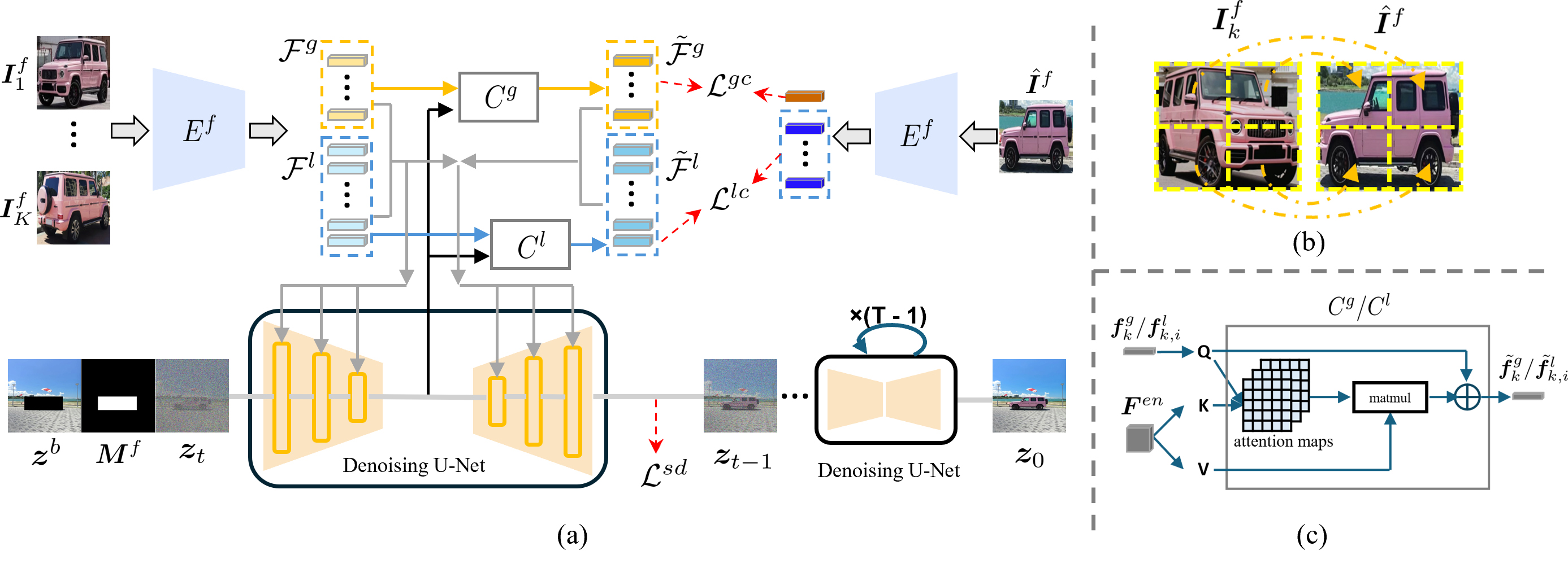 The illustration of our method: (a) Given multiple foreground reference images, we extract their global/local features, which are passed through the calibration module. The calibrated features are injected into the decoder of denoising UNet. (b) Illustration of seeking for the spatial correspondence of local patches between foreground reference and ground-truth foreground. (c) The structure of calibration module.