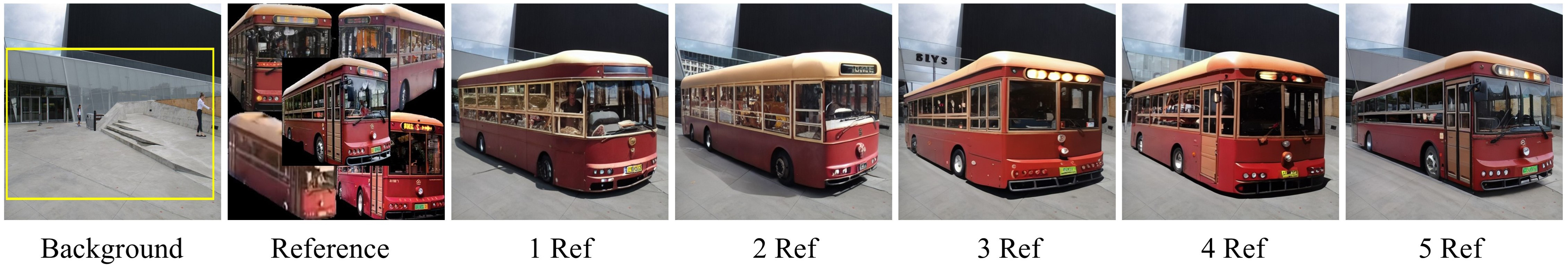 Multiple reference images could provide supplementary information, while a single reference image may lack the information of other viewpoints or occluded parts. In the following example, we show the composition results using 1 to 5 reference images. When only using one reference image capturing the left side of the bus, the generated bus does not have a door, because the model does not have such reasoning ability to infer that a bus should have a door on the right side if it does not have a door on the left side. When using more reference images, the generated bus has a door by learning from both left side and right side of the bus.