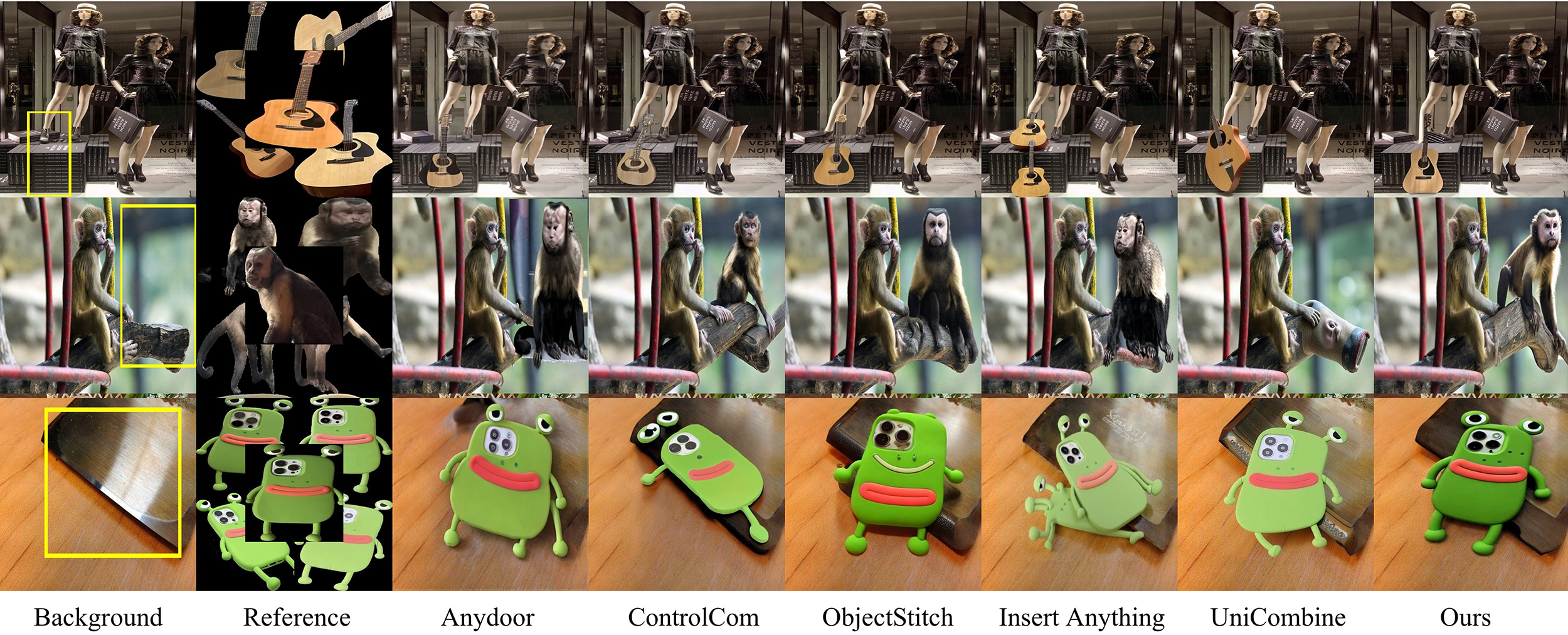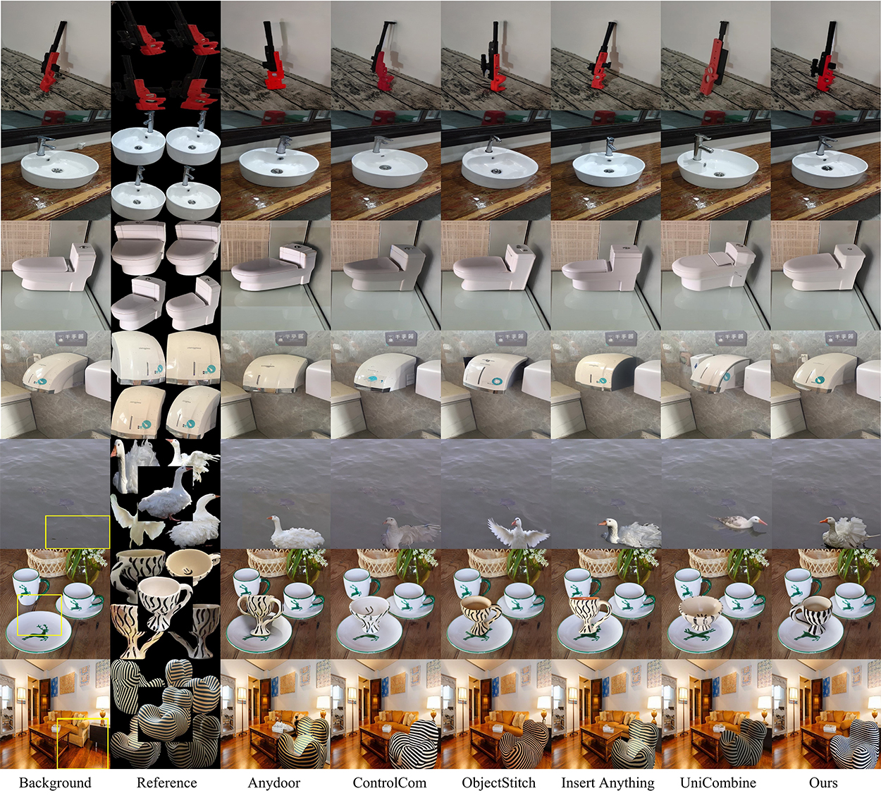 More comparison results between our method and baselines. From left to right, we show the background image with foreground bounding box, the reference images of foreground, the composition results of Anydoor, ControlCom, ObjectStitch, InsertAnything, Unicombine, and our method.